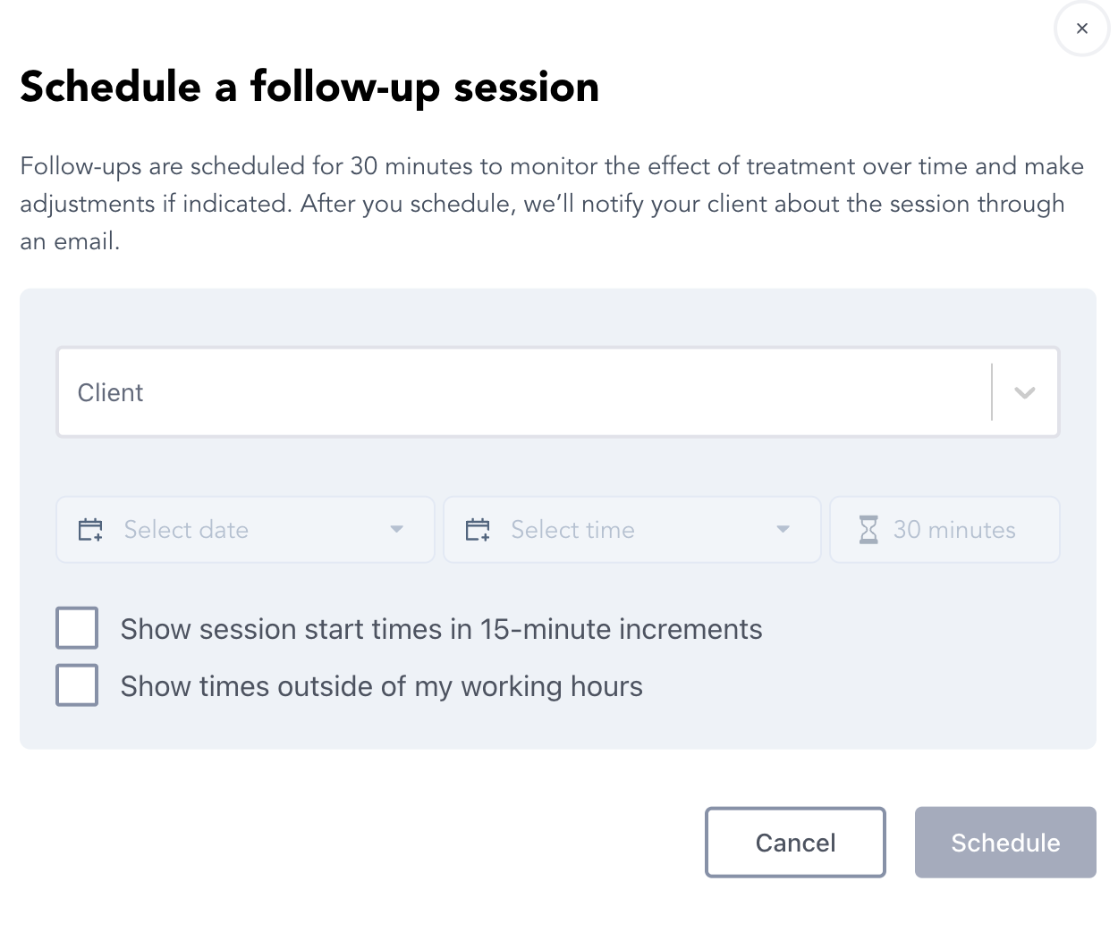 The Schedule a Session feature allows you to schedule sessions on behalf of your clients. This may be helpful for scheduling your next session while you are still meeting with a client. There is also the option to schedule sessions that fall outside of your set working hours.