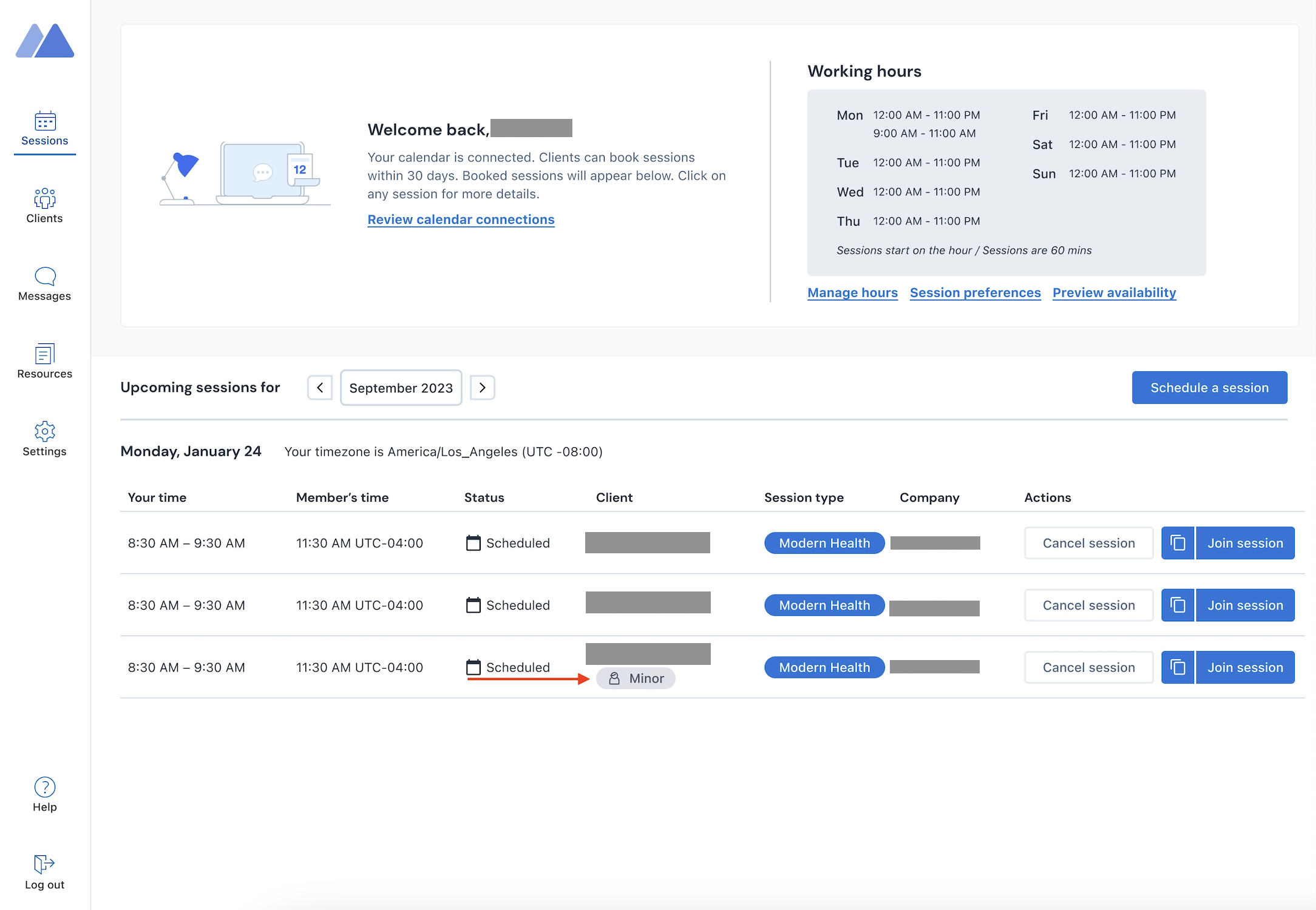 Providers are able to meet with minors within their Modern Health app via the autogenerated Zoom link in the Dashboard.