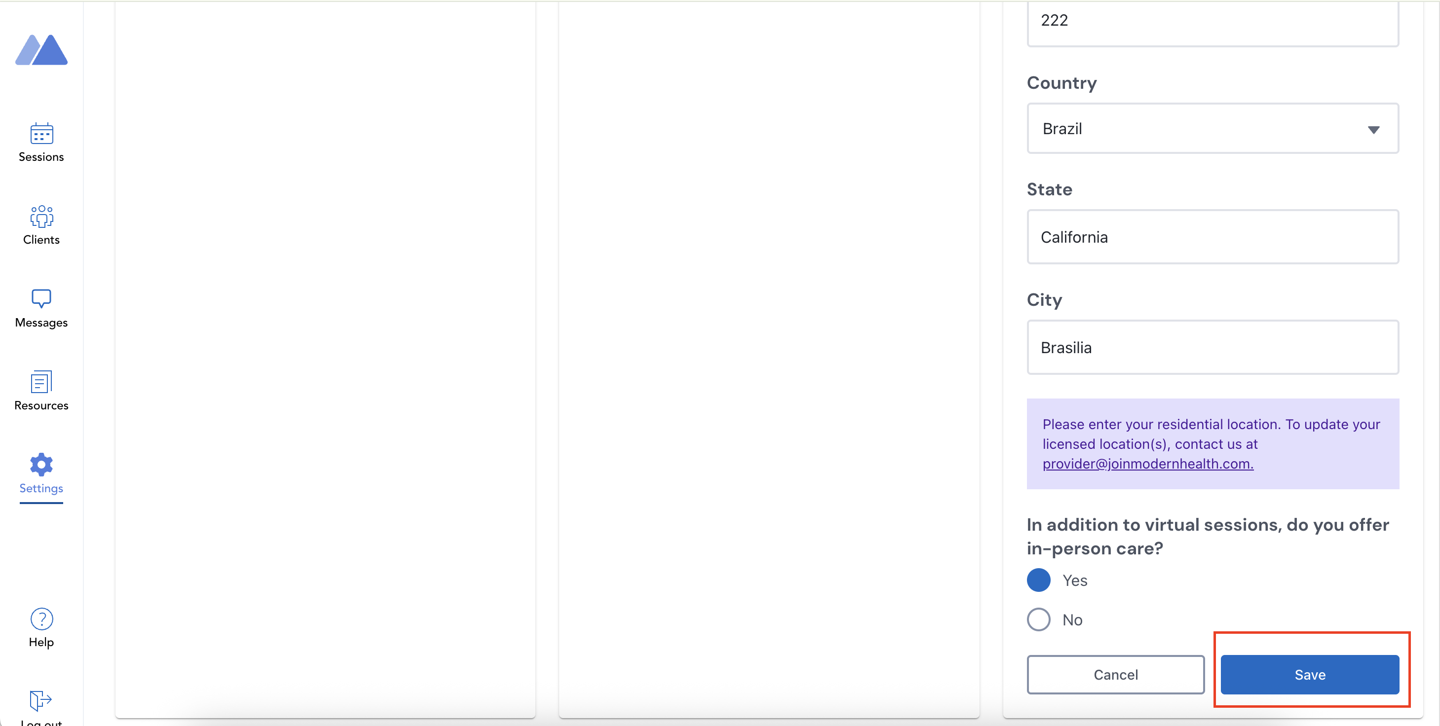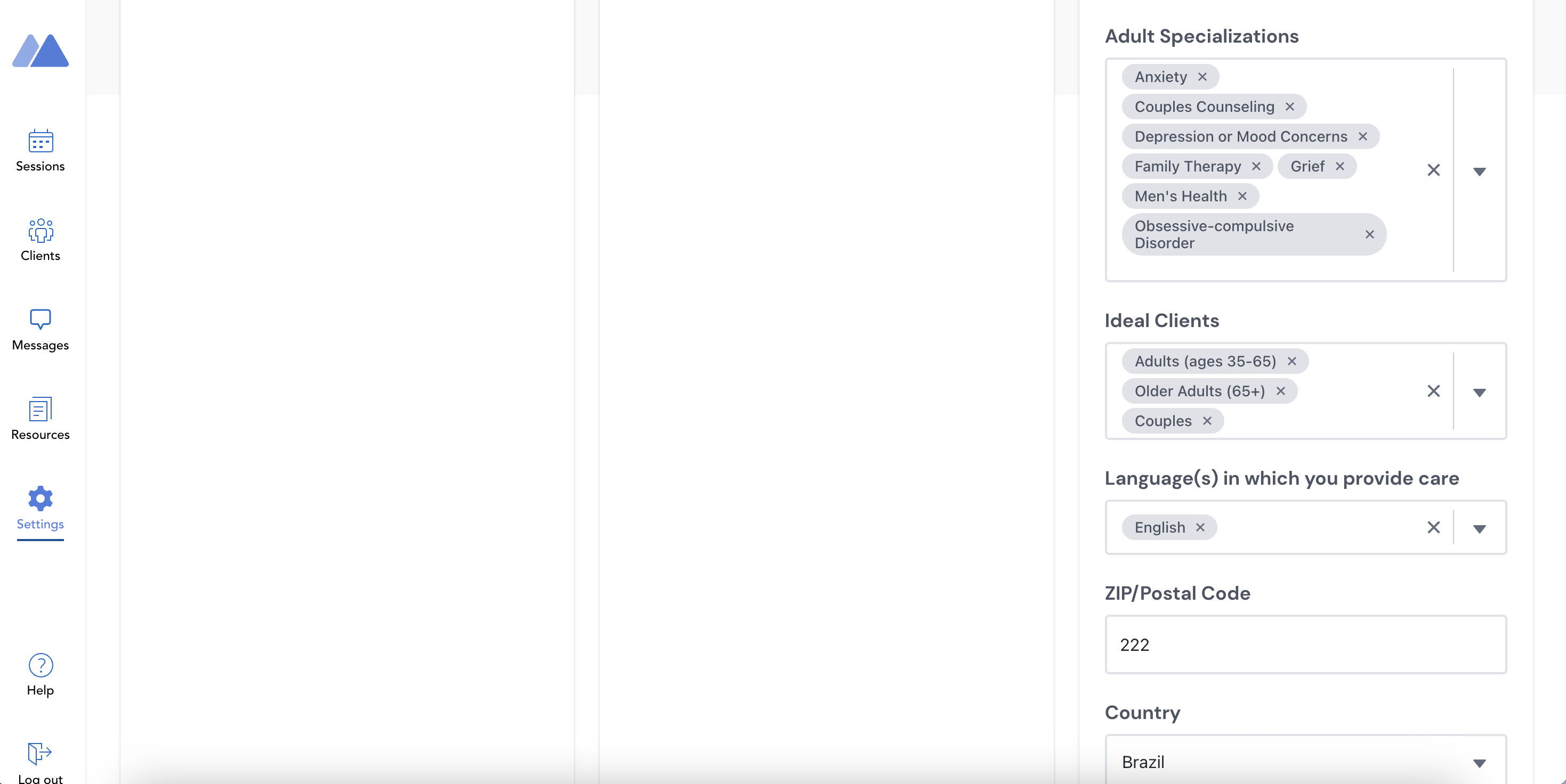 - Residential Location - Zip code/Postal Code, Country, State, and City (Note: For therapists, this does not affect your licensed locations. To edit licensed locations, refer to this article.)