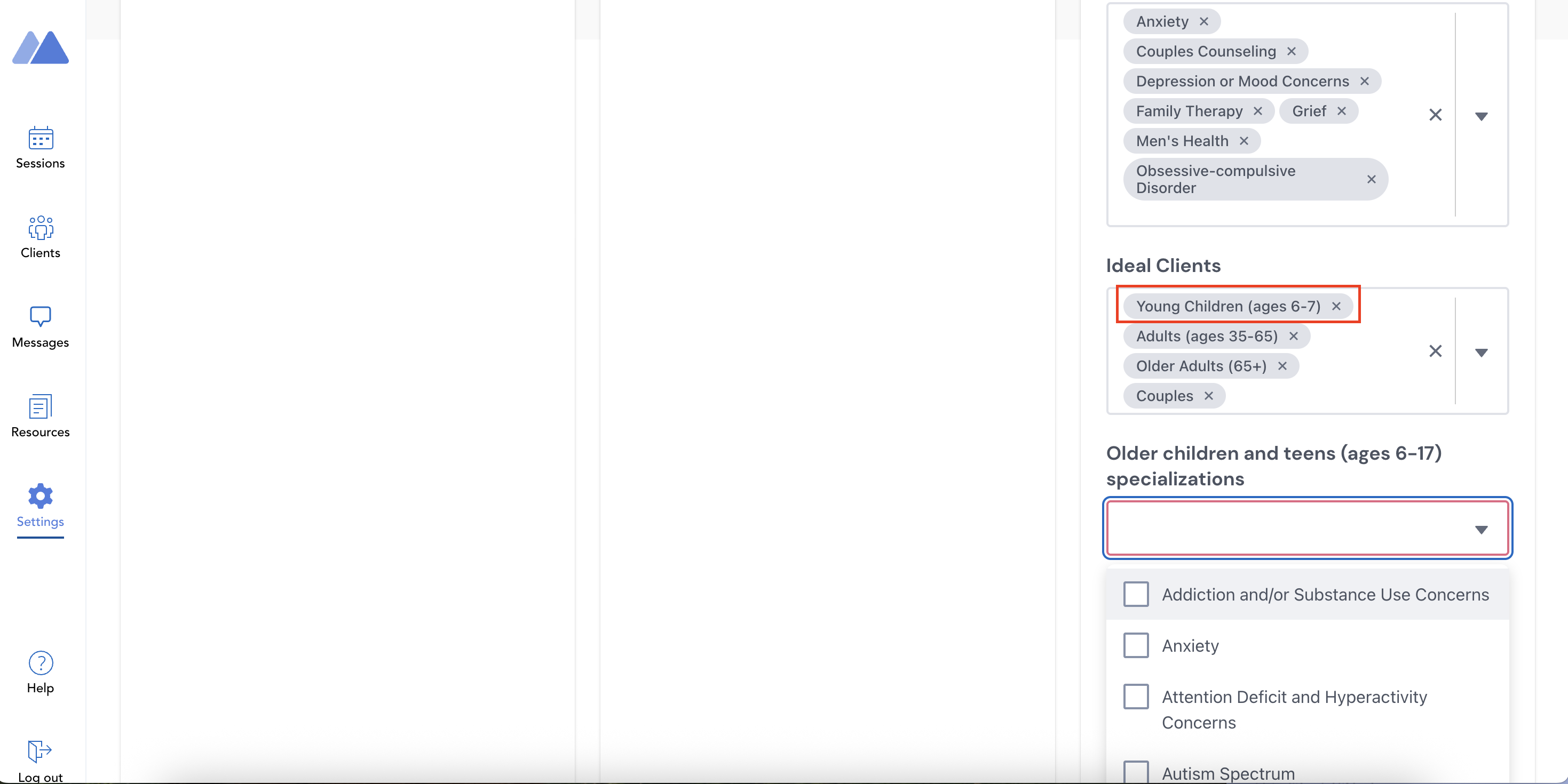 Child and Adolescent Specializations: These fields become available only if you include these Client types in your Ideal Client field.