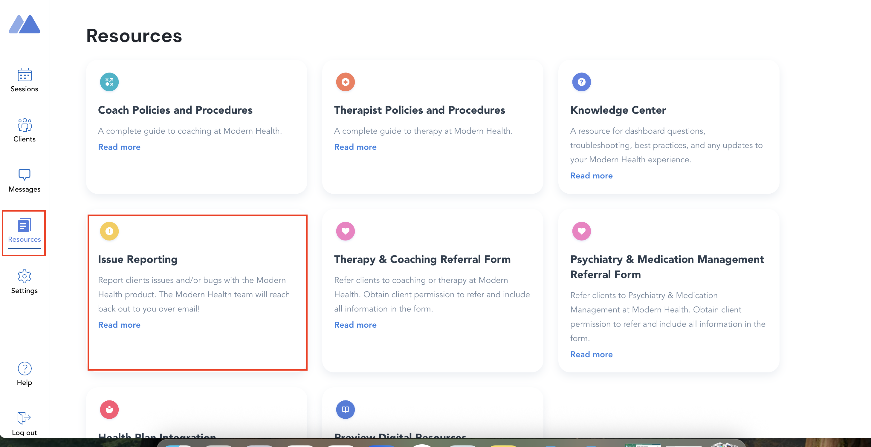 Use the Issue Reporting Form to report product/technical bugs with Modern Health. Before submitting, check the Help Center for answers. If still unresolved, access the form via the Resources page of the provider dashboard or the direct link below. Provide detailed information about the issue, including screenshots when possible. After submission, the Modern Health team will review your report and follow up by email to offer further assistance.