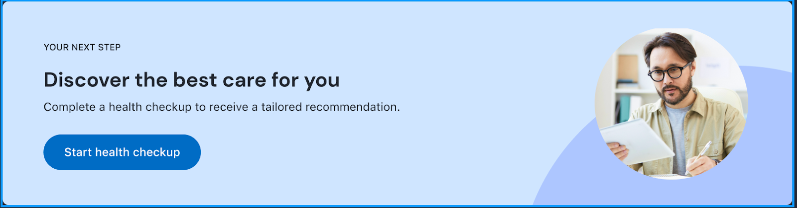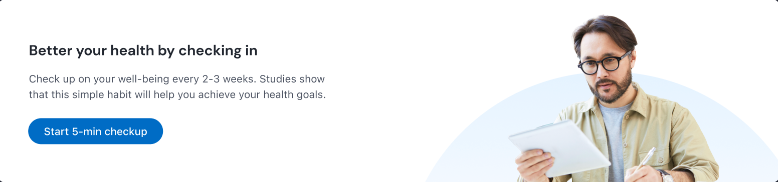 After having been matched with a provider(s), the member will continue to receive email automated reminders to complete a health checkup before 1:1 sessions and will see the below prompt from their Home Page every 2-3 weeks.