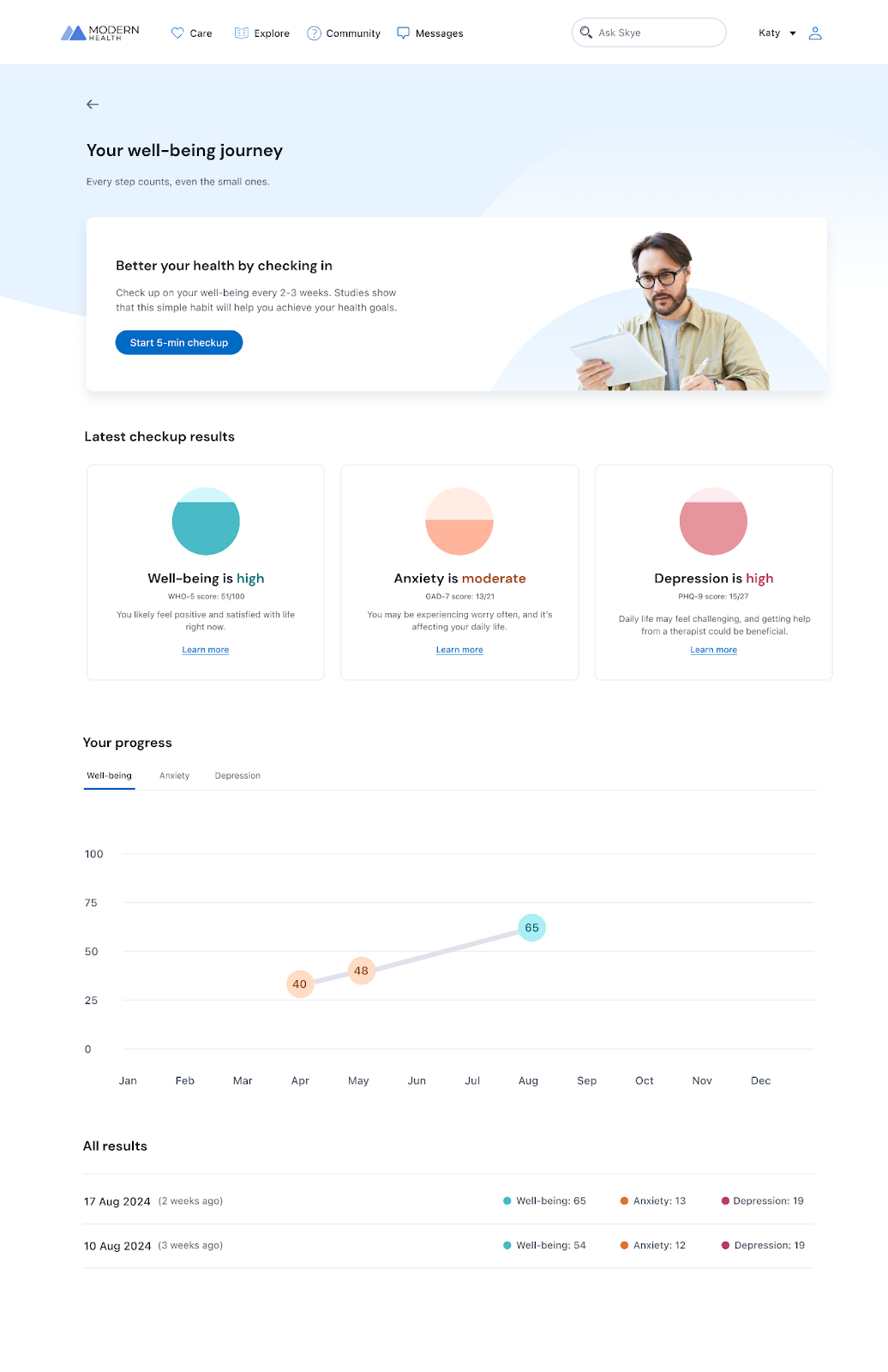 Consistent with evidence-based practice and clinical standards of care, Modern Health Members can view the results of their clinical assessment scores from the WHO-5, PHQ, and GAD on their well-being journey page. This article reviews the features of the well-being journey page and provides guidance on how you can support members in understanding and using their scores to guide care.