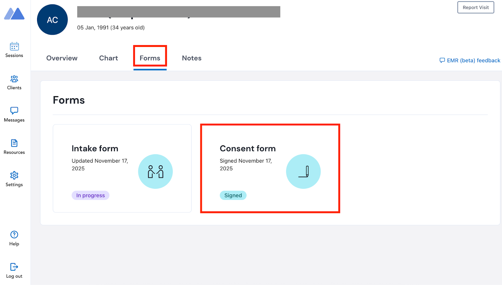 - Verify the completion status of the consent form in the ‘Forms’ tab within the Provider Dashboard ahead of the first session.