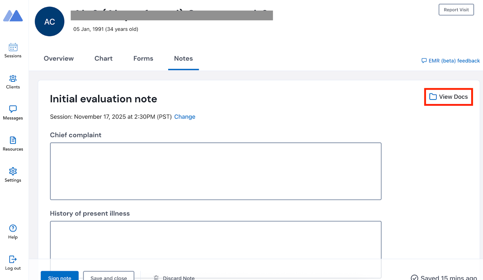Used during first sessions to assess a member's clinical history, perform mental status exams, document diagnostic impressions, and inform treatment planning. A structured template ensures all key data is captured.You are not required to fill in all fields of the Initial Evaluation Note. Providers should use their best clinical judgement to determine which ones are clinically appropriate in a therapy setting and therefore should be completed.