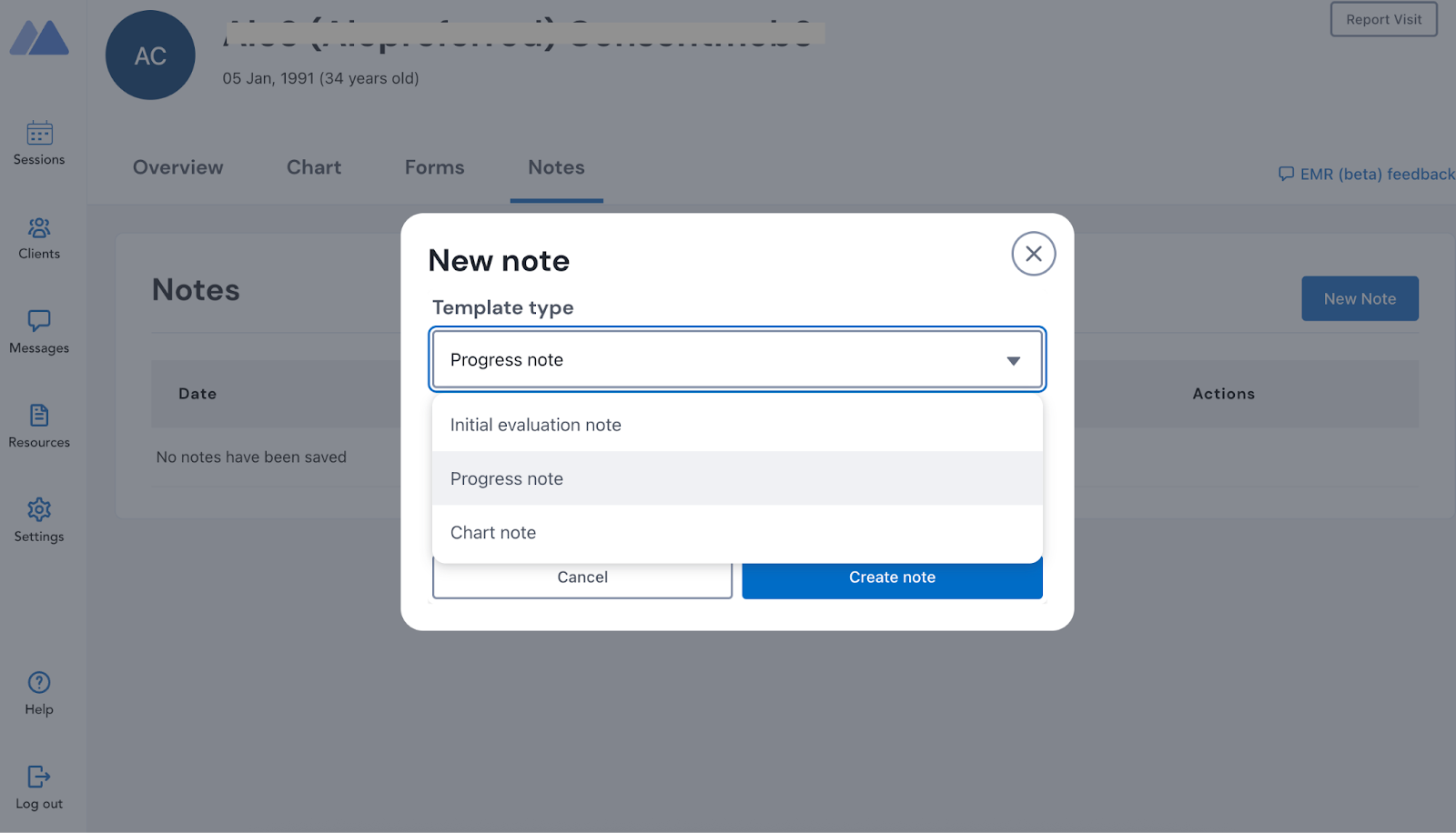 - Choose the Initial evaluation note template and click ‘Create note’.